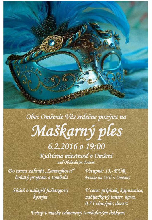 Obec Omšenie Vás pozýva na MAŠKARNÝ PLES, ktorý sa bude konať dňa 06.02.2016 o 19:00 hod. v KULTÚRNEJ MIESTNOSTI.