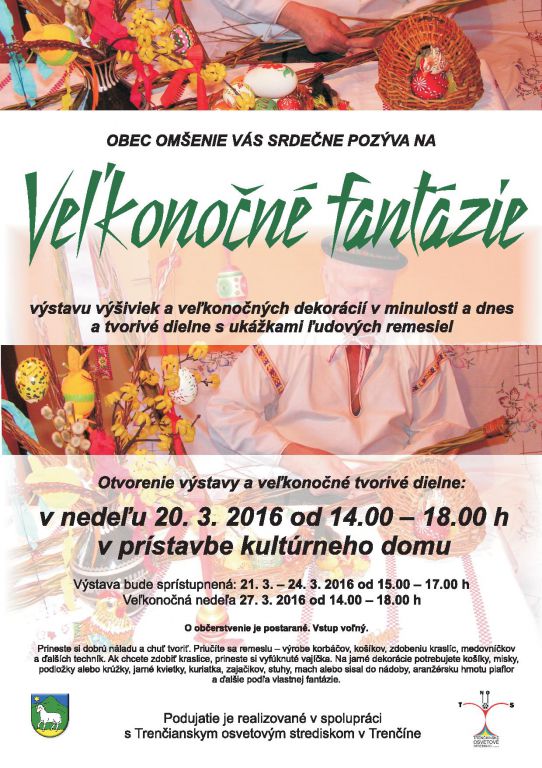 Obec Omšenie Vás srdečne pozýva na výstavu výšiviek a veľkonočných dekorácií v minulosti a dnes. Uvidíte aj tvorivé dielne s ukážkami ľudových remesiel.